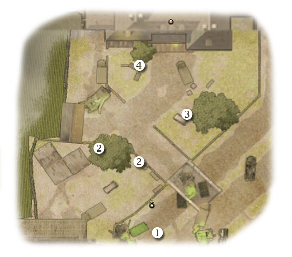 You won't spend too much time in front of the train station, however you'll have to be careful here. You are moving towards a small area and this will make the next fight more challenging. You start to the south of the station (1 on the map). Order your men to take cover behind brick walls (2 on the map) [#263]. Wait for the Germans to reveal their positions.