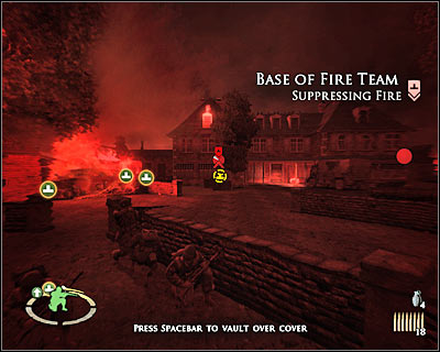 Take cover behind the right wall and spend a while trying to figure out how to eliminate enemy troops. Obviously the most important thing here is to disable a new MG nest (4 on the map) [#264]. I'd strongly recommend using grenades. As for the other group (3 on the map), your standard rifle should do the trick, as long as your teams are suppressing the Germans. You will be transported to a new area once you've dealt with both groups.