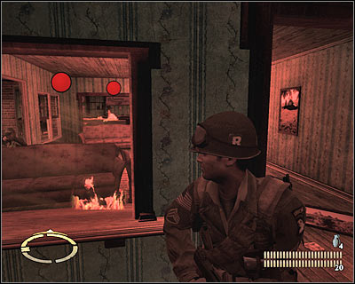 Ignore the fact that you don't have the map of the building, because there's only path leading to your destination. Proceed to the stairs and head on to the upper floor. Find a good cover once you've arrived. I would recommend choosing a wall [#265]. There are enemy soldiers in front of you and you must kill them from here.
