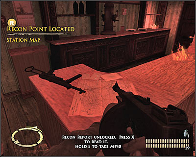The second group is hiding near the bar. This time you should consider using grenades, especially since you'll come across supplies in the near future. Find a table with a map on it [#266] and unlock the second recon point. Read the report (Station map) and proceed to the next room. Go back to the ground floor, exit the building and await further instructions.