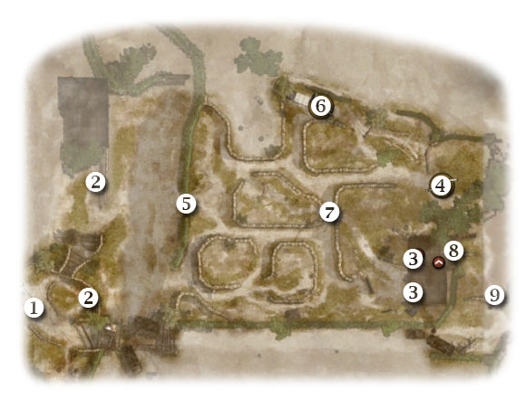Map legend: 1 - starting area; 2 - best cover points for your squads; 3 - MG nests; 4 - second cannon; 5 - passageway near the river; 6 - ammo stash; 7 - small bridge; 8 - first kilroy; 9 - next area
