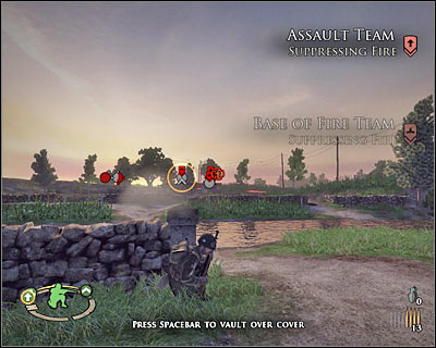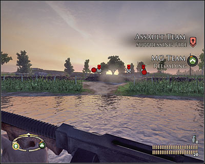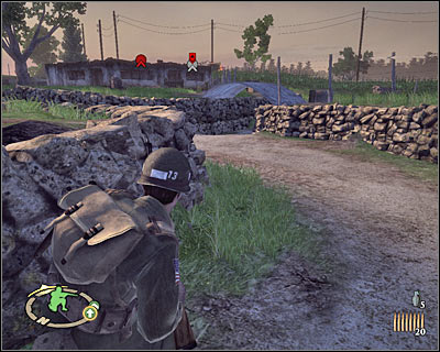 Before you decide to leave cover, make sure that the area in front of MG nests isn't occupied by any German soldiers. It's important, because otherwise they could have surprised you in the future. Start RUNNING east. Cross the river and keep heading towards the northern passageway (5 on the map) [#292]. Press the crouch key once you've arrived to avoid injuries.