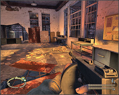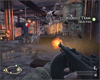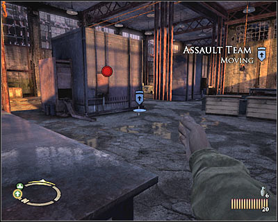 It's going to be extremely important now to issue correct orders, because powerful enemies have appeared in the northern section of the factory. Order your base of fire team to take cover next to the northern window. There are two MG nests in the distance (6 on the map) and your colleagues must suppress the gunner located on the first floor. As for your assault squad, order them to follow you and proceed towards a narrow passageway (7 on the map) [#122] which has been unlocked to your left.