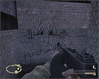 You will find yourself standing inside a long corridor. Thankfully, you'll be safe here against enemy attacks. Keep heading north until you've found the first kilroy (8 on the map) [#123]. Press the action key to finish painting it. Once this is done, approach the stairs CAREFULLY. Get ready to engage enemy troops.
