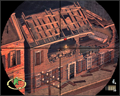 You will be standing in the exact same spot where the sniper was hiding (1 on the map). This objective is divided into three parts. You will have to defend against three waves of enemy attacks and you'll watch short cut-scenes between the waves. Before you even start attacking enemy units, you should think about how to play this out. It's much easier to be standing behind a small wall [#141], however you will have problems if someone manages to get closer to the factory. If this occurs, you'll have to leave the cover for a second or two to make the shot.
