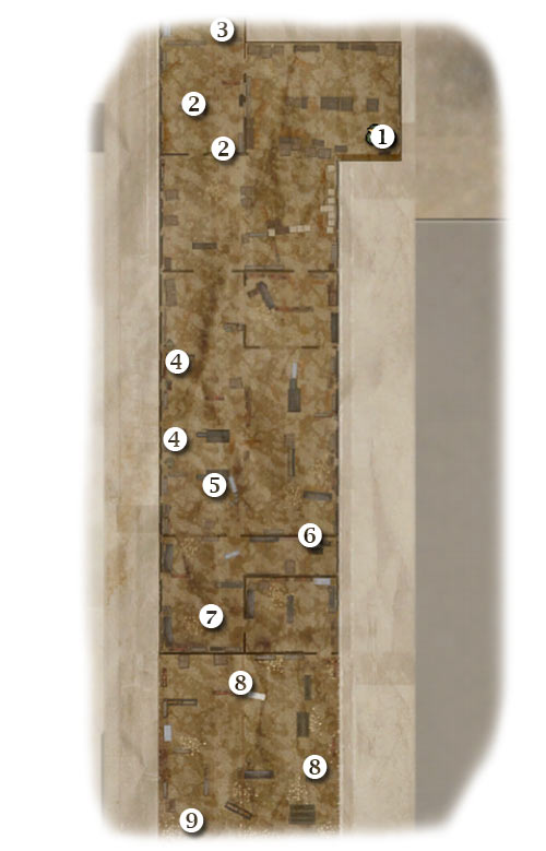 Head on to a much larger room. After making a few steps you'll be presented with a short cut-scene. Notice that an enemy patrol is heading your way. You must act quickly if you want to surprise the Germans. Send your teams to the west and to the south (8 on the map). Wait for the Germans to get here and take them by surprise [#132]. You may proceed to the next area (9 on the map) right away or you can go back for additional supplies.