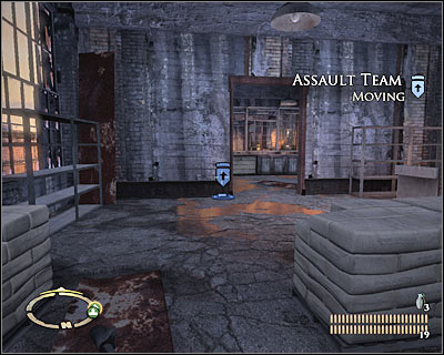 Once you've left the elevator (1 on the map), you must be very careful, because you and your teammates are going to be attacked by an enemy equipped with a rocket launcher. Don't stay in the open. Instead, run to a nearby room (west of the elevator). Order your men to take cover (2 on the map) [#127]. I would recommend sending the base of fire team closer to the windows.