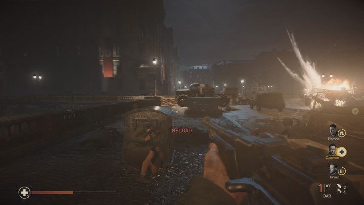 Time to plant the second bomb. Head for the Place explosives on the South Gate marker. German troops are scattered across the square, but it's possible to avoid them. Go to the left part of the square and slowly move forward. Hide behind vehicles and kill silently soldiers that you cannot avoid. Reaching the second gate shouldn't cause too much trouble. The game will switch you to a different character.