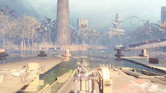 The last part consists of fighting on top of gigantic trees. Remember about eliminating as many enemies as possible and destroying drones before using the zipline. While using it, the player becomes vulnerable, which makes him an easy target.