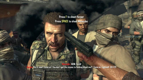 If you try to kill Menendez, he will grab Farid's arm and shoot at him (first picture above). When Farid will be lying on the ground, Menendez will get upset with Farid's treason and he'll say that for those whom Farid serves his life is of no importance (second picture above). Then he'll shoot him. Now there will be a short part of the mission, during which you will be firing at the turrets from the VTOL. When Mason lands, a battered Harper will tell him where Menendez has run away (third picture above). In the next missions Harper will be helping you.