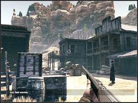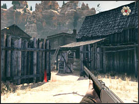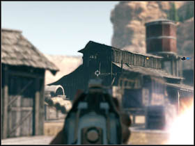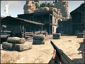 When you will get the key go back to the cell and open it. Behind the door no one will be imprisoned. In order to find your target you have to leave that building. Jump out through the same window which you used before (two gunslingers will wait there for you). Being outside the main road turned out to be blocked by the wagon with the guy with a heavy machine gun.