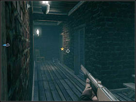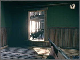 Continue your way till you reach boxes put one on the other. Right behind them will be open space with a dark barn in the end. Inside that barn hide shooters and if you lean out they will start shooting through the windows [!]. They are very effective so you have to be very careful in order not to die, lean out only for one shot. The right screen is showing the place where you should attack.