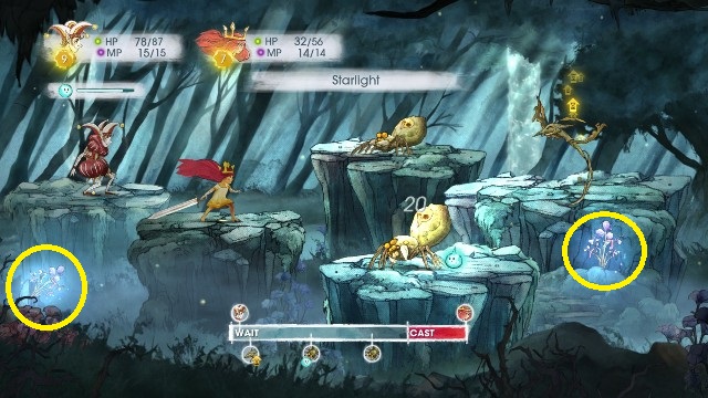 During combat, you can acquire both Health and Mana Points - you need to move the scrubs growing on the bottom of a battlefield with Igniculus. They regrow during a battle. In the picture above, they have been indicated by the yellow circles.