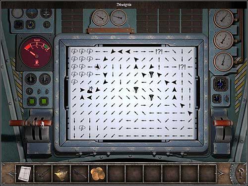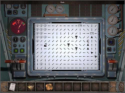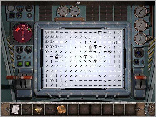 Taking all of that into consideration, press the circle representing the airship 8x (leave the 8th route variant on the screen - count from the moment you hear a distinctive sound). Afterwards click the next to last big arrow of the selected route (you should be near the anomalies) and when a circle representing the airship will appear on it, press it 5x. Once again mark the next to last big arrow of the route's next fragment (you should be near the tornado now) and press the airship symbol 4x. Once again select the penultimate big arrow of this fragment of the route and press the circle on it 5x (you should land on the island). The correct route is showed at the screen below. In the end pull the lever on the left and voila - you set off.