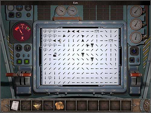 Now move to the control panel (in front, zoom). You have to set the airship (marked with a circle on the right) route so that it won't run out of fuel and will avoid all the obstacles (anomalies, storms or tornadoes) on its way to the island (marked with a palm on the left). Of course you have to consider the wind's direction, represented by the arrows.