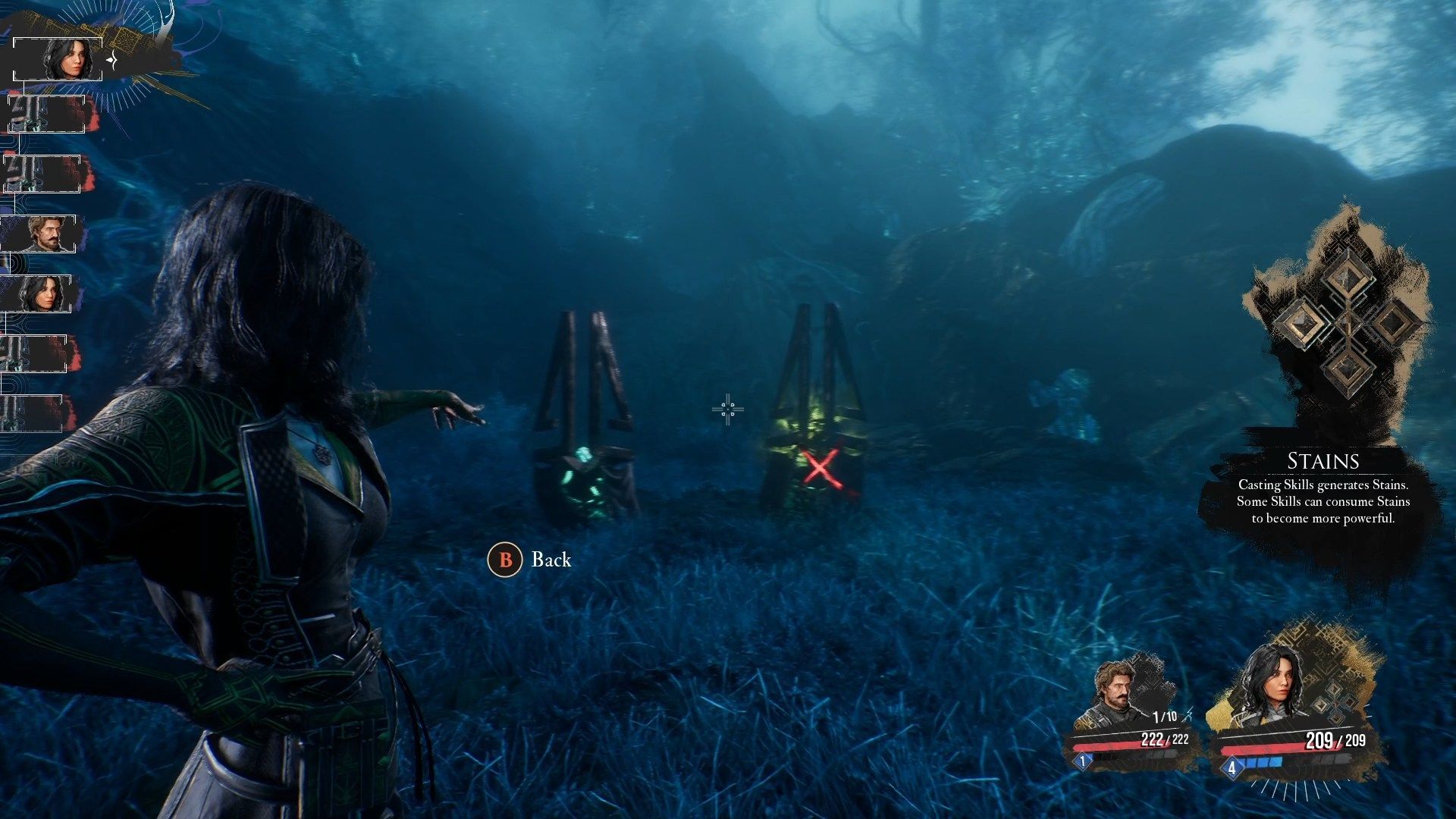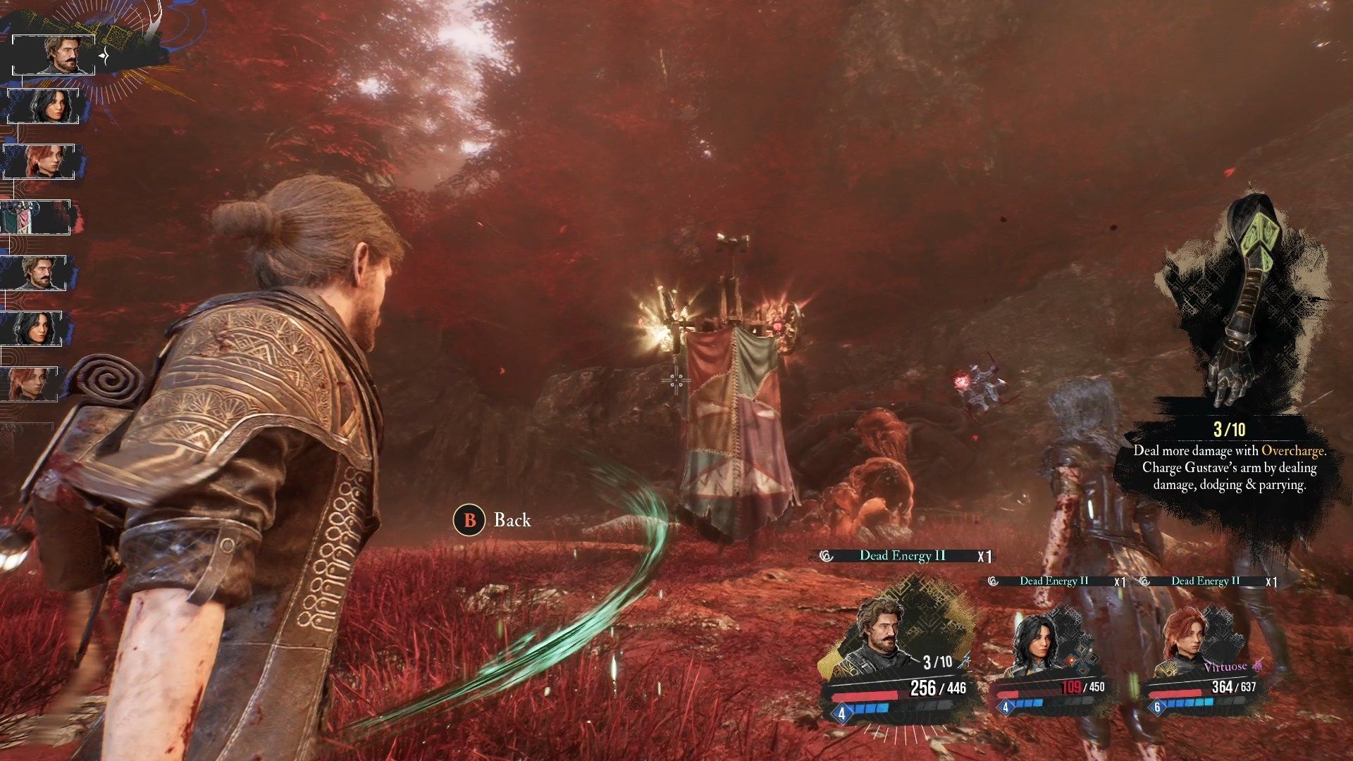 - Health drain - Contorsionniste drains health from the entire party and heals himself. Parry as soon as you see the red fog gathering around his mask.
