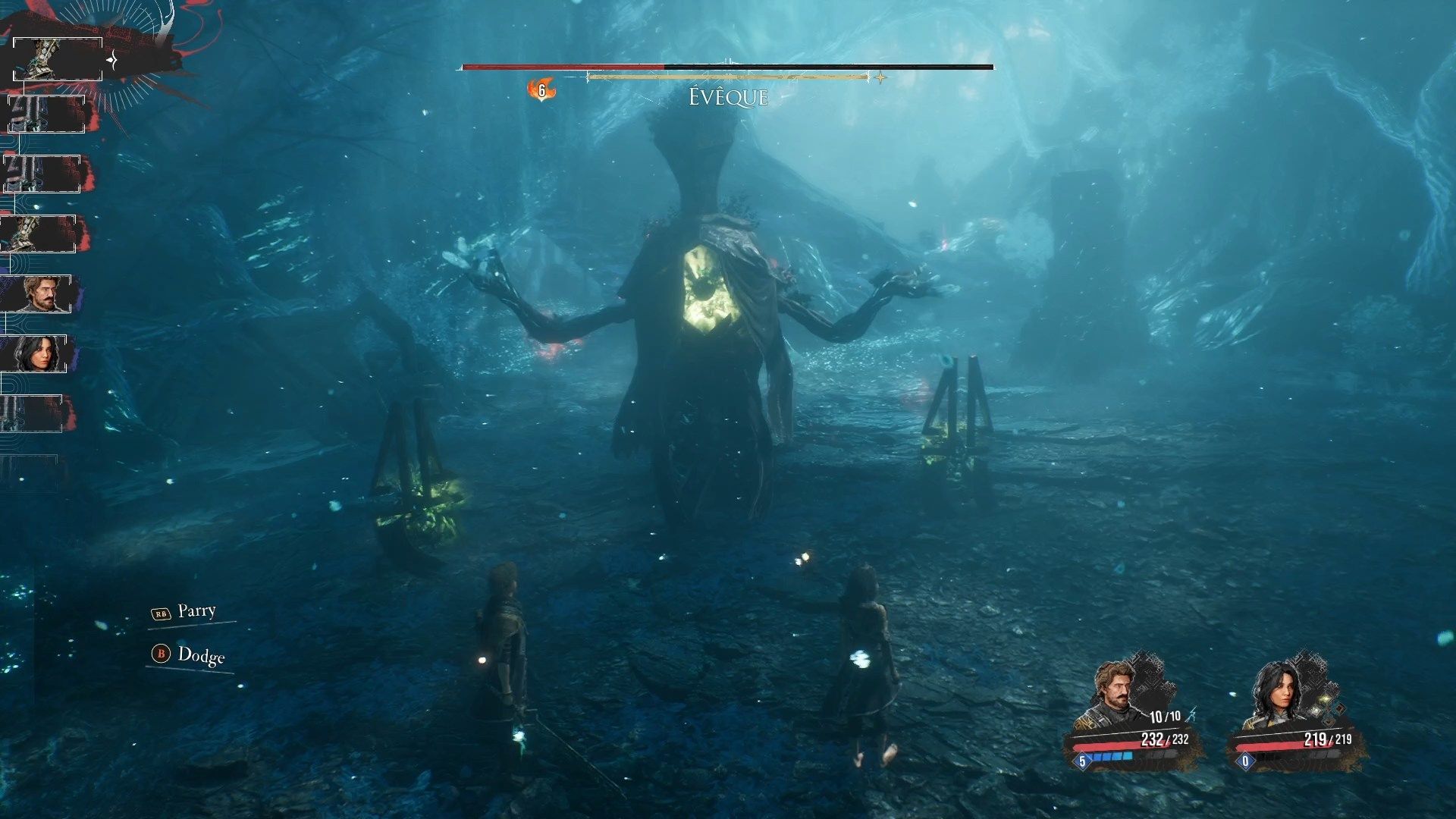 Eveque is a relatively simple opponent - you were preparing to fight it by facing Abbests. He is susceptible to ice. The boss starts the battle with armor - you have to get rid of three shields before you can deal damage to him. You destroy one shield with a single attack. Use skills that deal many weaker blows, such as Gustave's Lumiere Assault or Lune's Thunderfall and Electrify. Learn to parry his and Abbests' spell - it's easy to do thanks to the rhythm of the crystals, and doing that will give you a lot of action points.
