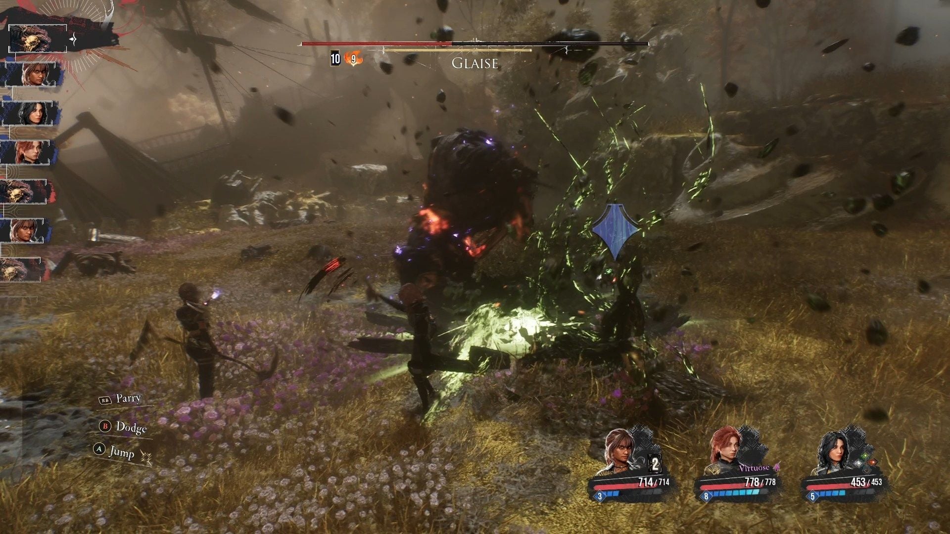 - Strike - area attack. Glaise jumps towards you and raises their hands, then hits the entire team. You have to parry mainly intuitively, but watch the boss carefully - Glaise's left knee twitches just before the strike.
