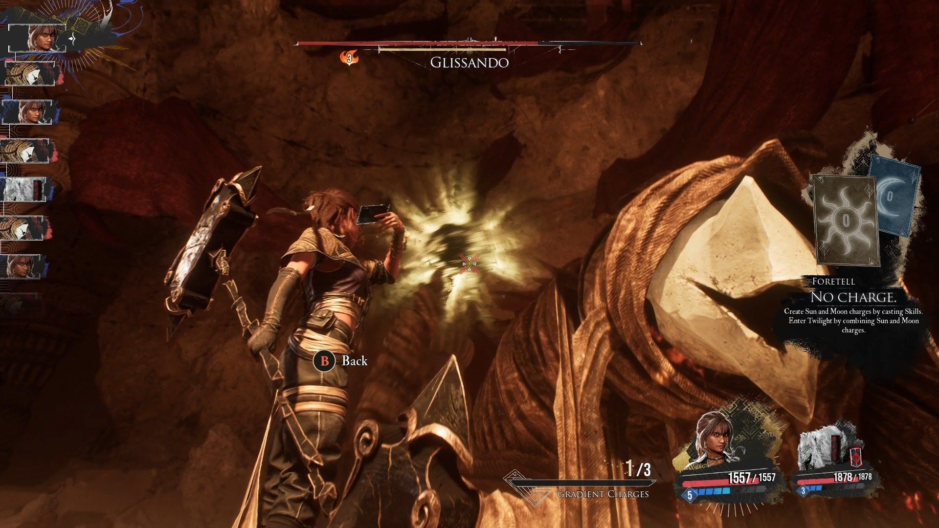 The boss is susceptible to Dark and resistant to Light. The fight with Glissando is a kind of a warm-up before the upcoming battle with Sirene. It introduces the Charm status: an enchanted team member spends their turns attacking the rest of the expedition, which can quickly prove to have catastrophic consequences. However, this status is not that important in this particular encounter. The only attack that inflicts it is very easy to dodge or parry. You can also equip the Anti-Charm Lumina, which you can obtain by defeating the previously encountered Tisseur, which makes you immune to the Charm status. Sciel is an excellent choice for this encounter, as she knows many skills that inflict Dark damage multiple times.