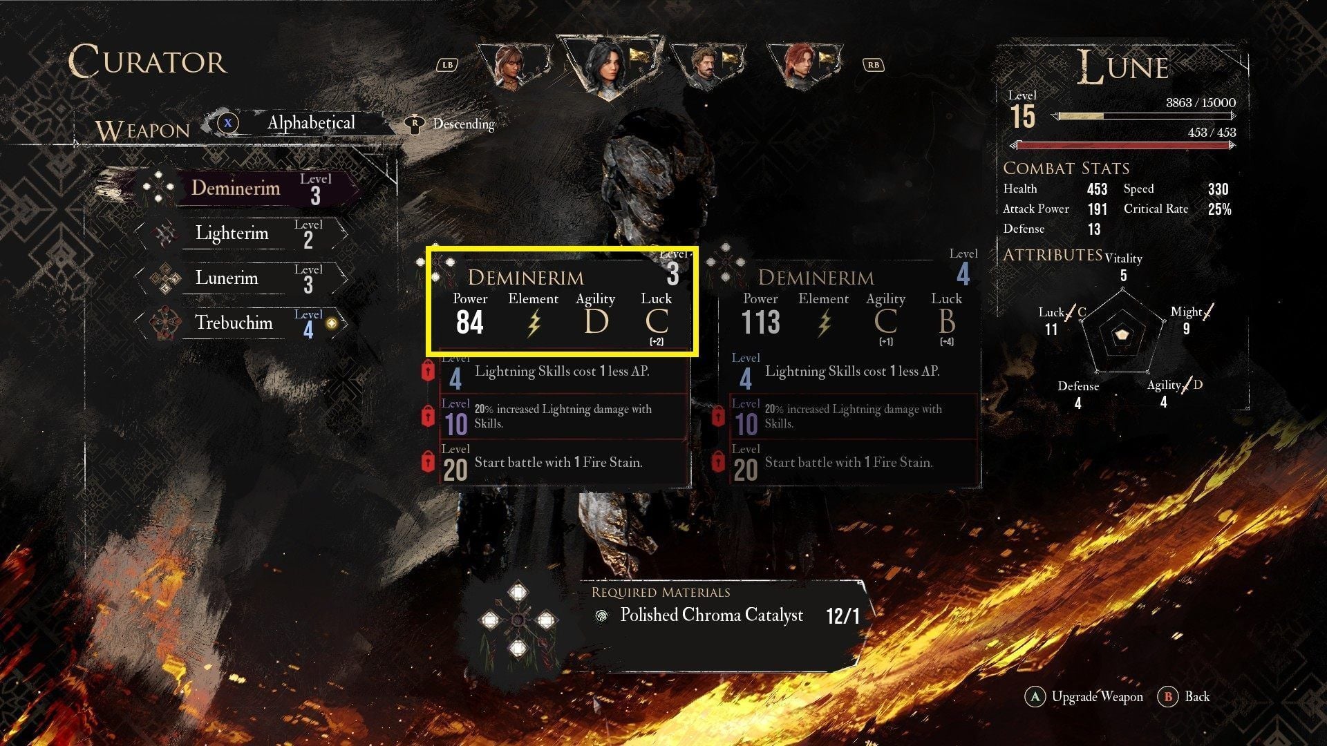 Of course, weapon upgrades are not free. In order to upgrade your equipment, you'll need so-called Chroma Catalysts. The basic version of this item allows you to upgrade a weapon up to level 3. For further upgrades, it will be necessary to obtain stronger versions of this item, e.g. Polished Chroma Catalysts (upgrades up to level 9).