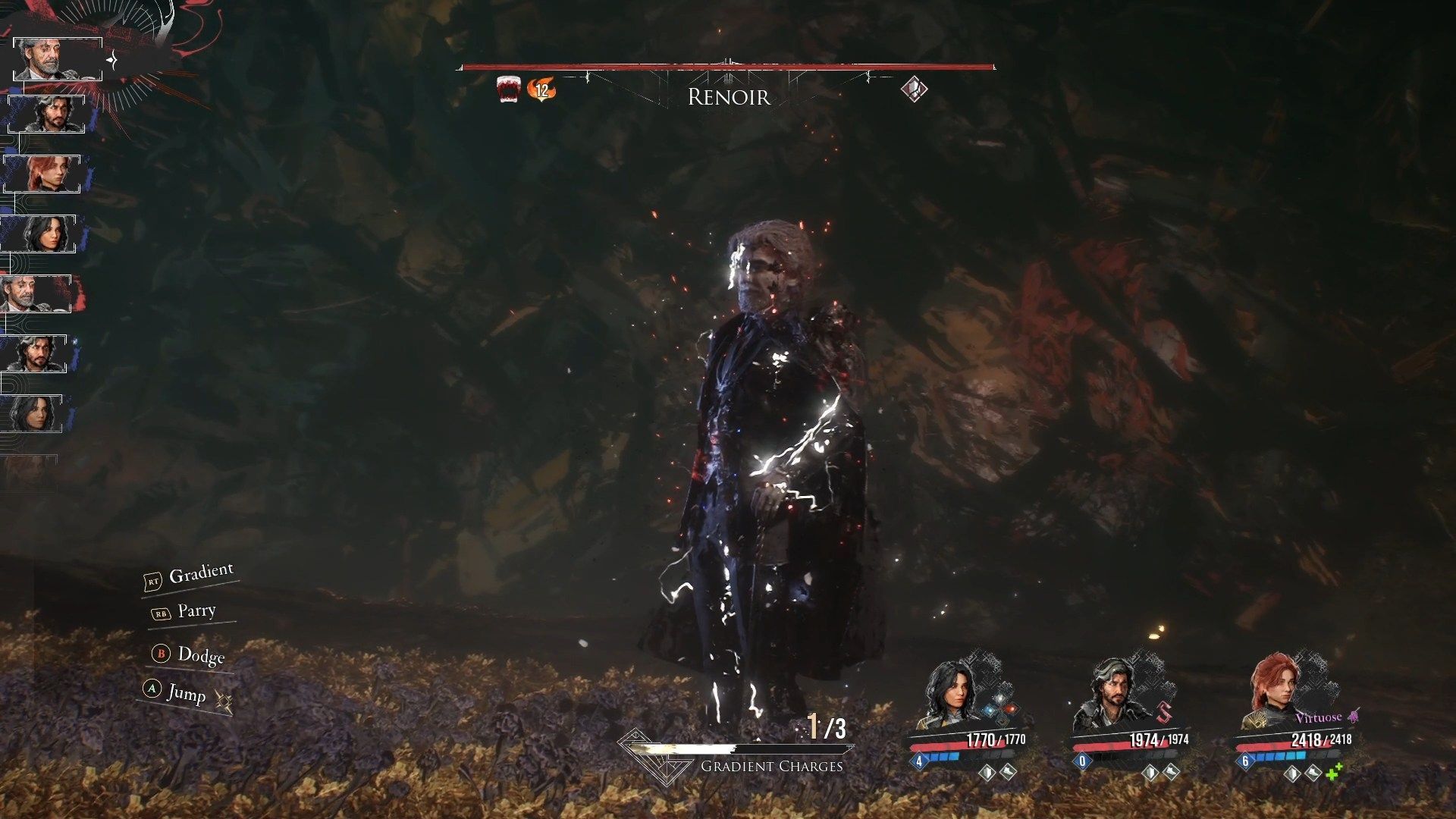 - Gradient Chroma explosion - Renoir collects a huge amount of Chroma and does a gradient explosion. Pay attention to the ink lines in the Chroma orb, which align while the attack is charging. Perform a gradient counter when all three lines are set vertically, horizontally, and diagonally.