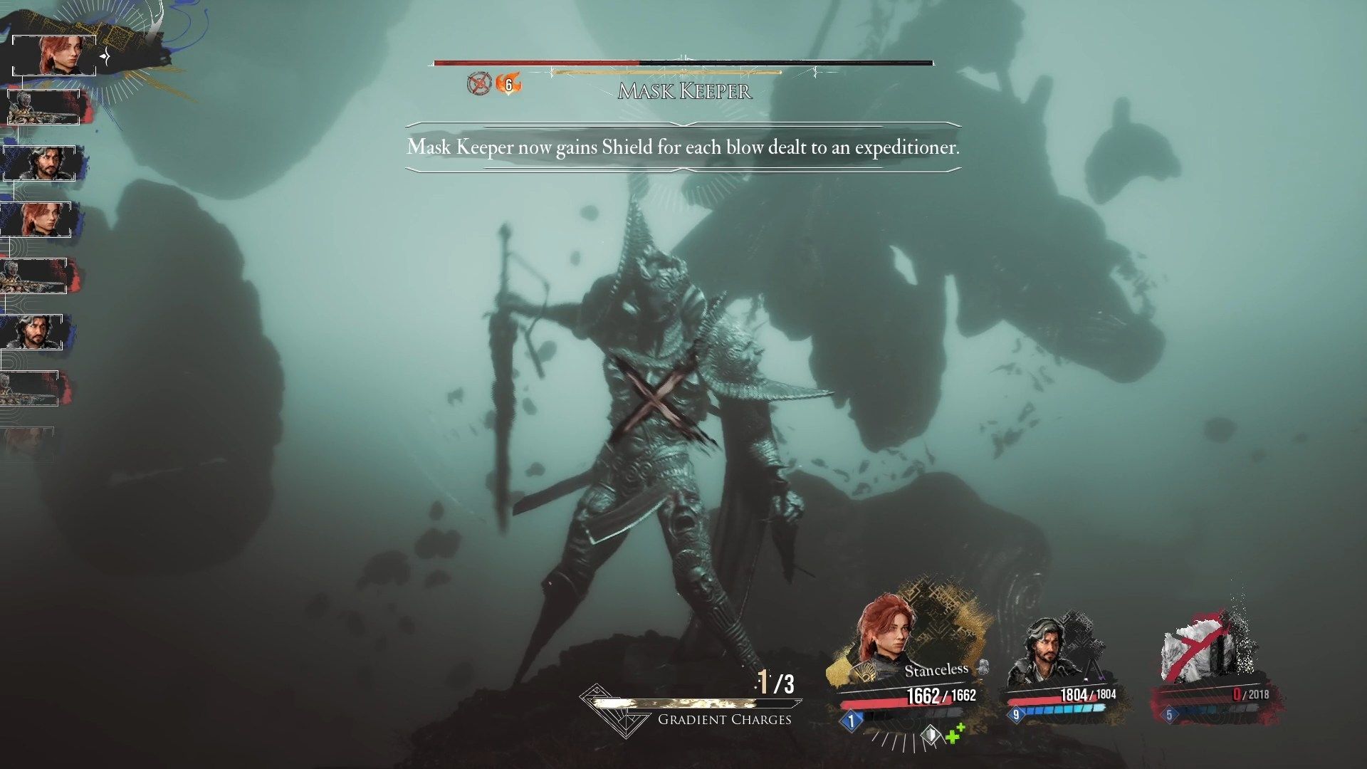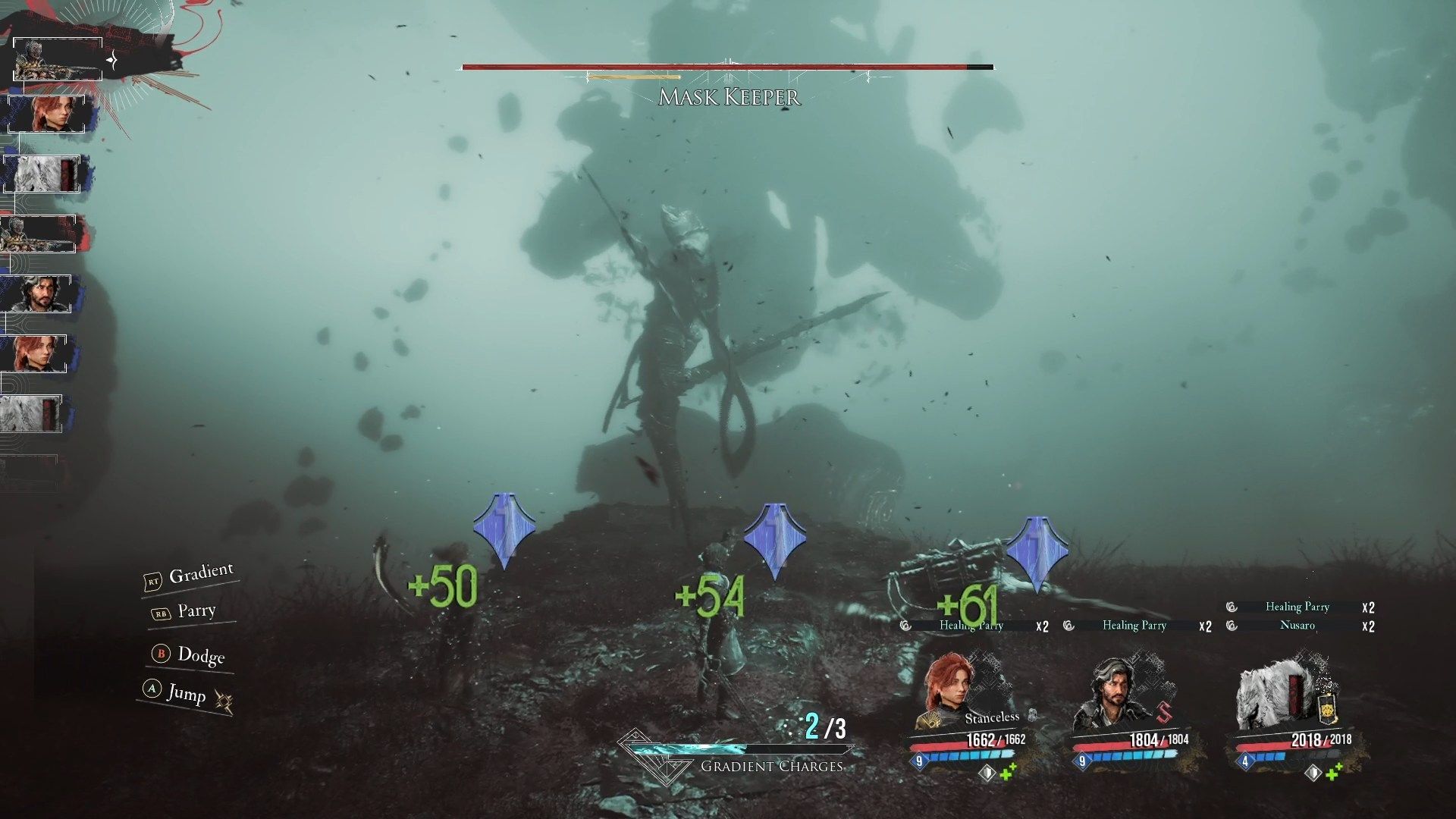 When the Mask Keeper has half of their health left, their combos will become longer, and the boss themselves will gain a shield with each hit from a team member. Beware especially of the swiping and chaotic combos, which are not preceded by any obvious visual signs and a steady rhythm of parrying.