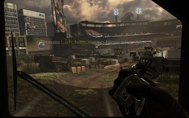 After a short voyage, you get to the stadium where you can see a lot of enemies. You get a detonator to the previously placed grenades. Detonate them when an information is displayed on the screen. After that, you have a short ride on the stadium during which you have to fire at enemies from inside a vehicle.