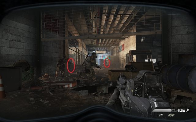 After a while a small group of soldiers will run from right. Eliminate them easily. Moving forward, you stand against a long, straight corridor. Hide behind a cover and eliminate running enemies. Use tear gas grenades if you find a bigger group of enemies or if you want to smoke out some particular annoying ones.