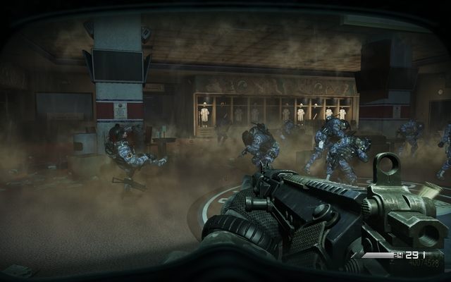 When you get to the door, you get an order to throw a tear gas grenade inside, what you should do. After a few seconds, you get inside the room full of coughing enemies; you have several seconds to eliminate them before they can defend themselves. After that, go left from your entrance. On one of cupboards you can collect another intelligence data. Join the rest of the squad.