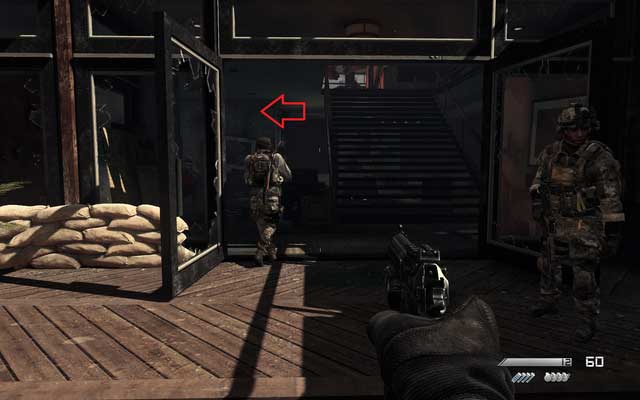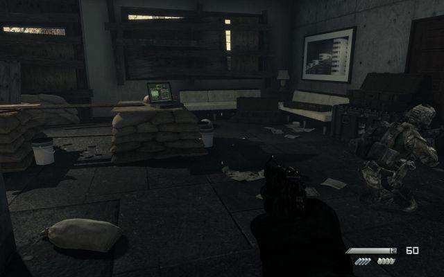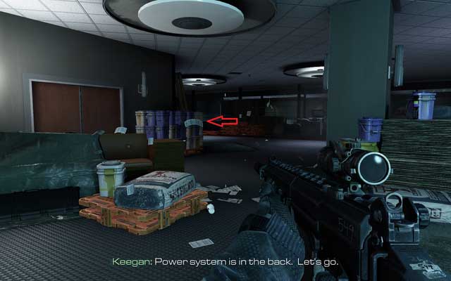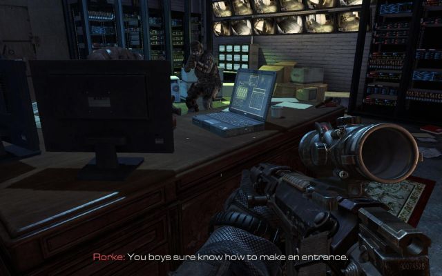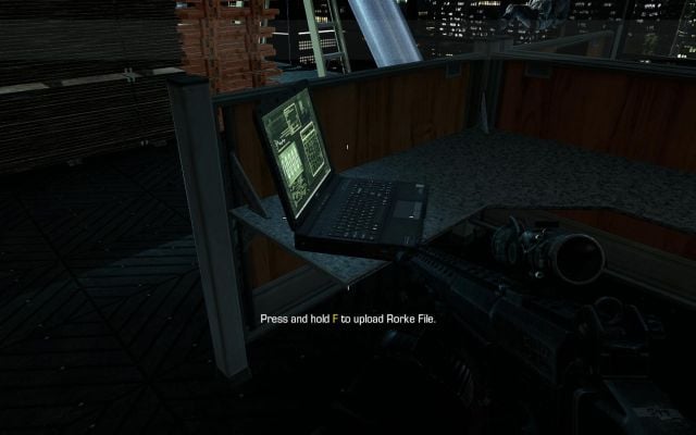 After you and Rorke, deal silently with the two enemies, pick up the weapon under the water and continue following your companion. You will reach a room where there are another two enemies - Rorke will give you carte blanche to deal with them. After you do, approach the spot where the enemies used to stand - on the desk, there is the laptop with the data.