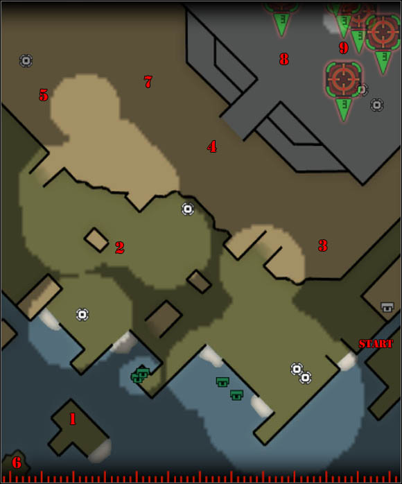 Start destroying artillery bases [2] [3] [4] [5]. Shells from this guns, are exceptionally strong and can seriously damage Shogun, so after the destruction of any artillery base visit hostile Tesla to regenerate.
