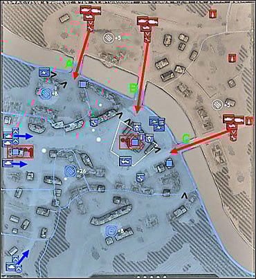 Germans will approach from grey zone (directions of their attack I've marked with red arrows on my map) and will try to cross three bridges (A, B and C) to get to yours (blue). So you should hold them on these bridges, they're the bottle-necks [2]. However, high command also ordered you to capture munitions points on the other side of the river but don't bother - without heavy equipment you have no chance to do it.