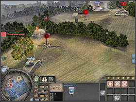 At the same time your tanks should drive left (to the west) from a tower passing it by and turn south-west (driving downhill) to hunt down from sides or rear two PzKpfw IV tanks hiding behind the hedgerow. Destroy also a bunker below, capture with your infantry nearest strategic and munitions points. [15]