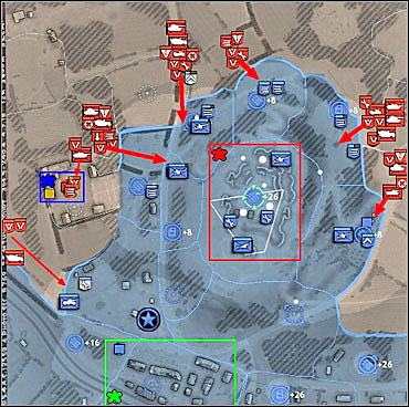Eliminate Germans attacking at the same time from several directions (marked with red arrows on my map) with your HMGs and AT guns fire. If you see too many enemies use against them your howitzer located on the hill, don't hesitate also to shell them with your off-map artillery if you already have this possibility. [8]