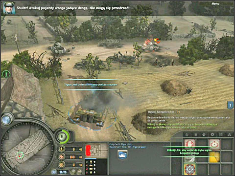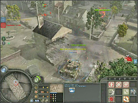 This scenario is based on a real campaign (in fact every other is also based on one) of Michael Wittmann, German tank expert who on June 13, 1944 destroyed the 4th County of London Yeomanry, British 7th Armoured Division squad, the famous "Desert Rats". Though Wittmann was commanding a while platoon of tanks and here we have only one Tiger under out command, there is no doubt that Hauptmann Voss is Wittmann's virtual alter-ego. Your first task is to stop the British convoy travelling the nearby road. Drive the Tiger near it to begin the massacre. You can shoot by successively pointing the next targets, or check out the new addition in this part of Company of Heroes, the direct fire mode. In order to use it, press the icon in the panel in the bottom right corner or press the D button (the default setting) and destroy the British vehicles while controlling the Tiger's gun. However you won't be able to use this tank for too long, because the engine will break down soon enough and your Tiger will be quite useless. The driver will take care of it and in the meantime you should concentrate on destroying the enemy vehicles. Especially look out for the Cromwell tanks and Staghounds. Destroy everything else if there aren't any around. Once the Tiger is up and running again head forward to the crossroad on the right, while still shooting the enemy vehicles and also soldiers.