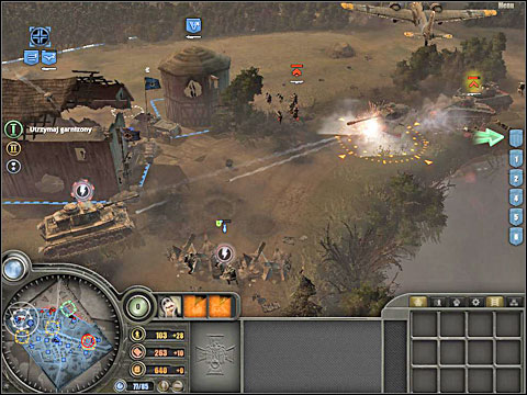 At some moment, the German command will aid you with some tanks (including a great Panther), assault troops, sappers and an armoured transporter - they reinforcement will enter the map from south. Although it has to be said - these German forces aren't much, compared to the Allied units that giving you a hard time on the north. Because of that, you should use them very carefully and additionally reach the population limit by recruiting the maximum number of units, before the reinforcements appear. You're fighting mainly with tanks (I think that apart from weak Shermans I had also seen much better Pershings as well as Hellcats and M10, both quite dangerous), so it would be wise to arrange yourself some Henschel plane support, by spending your experience points on them. The plane does a few air-strikes, damaging the enemy vehicles in the given region - don't waste this on single tanks!