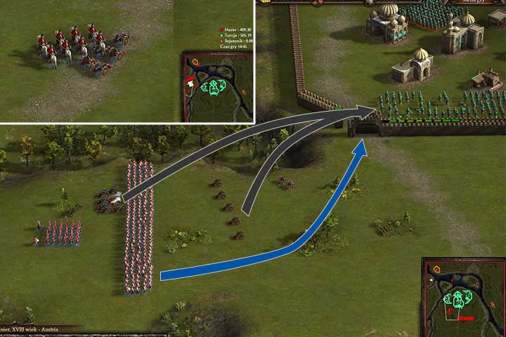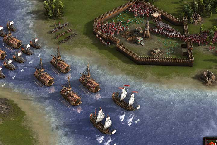 Use your grenadiers to attack the towers, and then command your cavalry to rush to the inside of the fort. After a while, you'll receive transport ships and artillery set that will be useful during the siege. You'll also receive ships that need to be sent to a small sea battle on the river. Load your soldiers and transport them to the other bank. Remember that during unloading the formations will automatically be dissolved, so you will have to organize your units again. You can use a small trick and exploit the map a little. Don't load the final unit (no matter which). Send your ships to the west, and destroy the enemy fleet. In the meantime, transfer your units to the second bank, preferably in the place where they appeared.