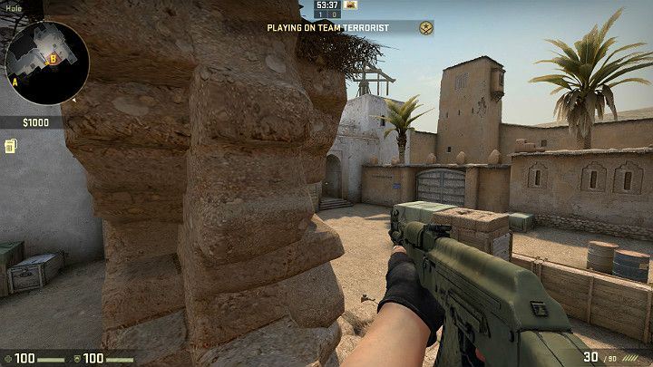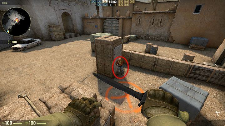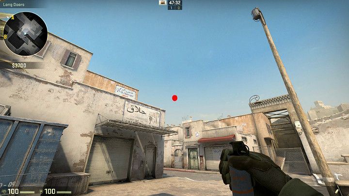 The created smoke screen will protect you from players attacking from the Terrorist Spawn Zone. Furthermore, it will limit field of view of all the enemies looking through the doors. In the meantime, you will be safe behind barrels on the left side, right next to the telegraph pole.
