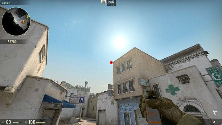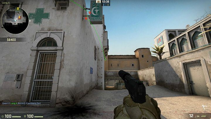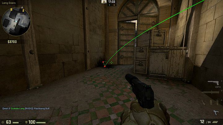 If you want to go through the tunnel towards bombsite B, you can aim a flashbang at the ceiling and use LMB to throw the item while moving. Move forward - the grenade explodes behind your back and disorients your opponents.