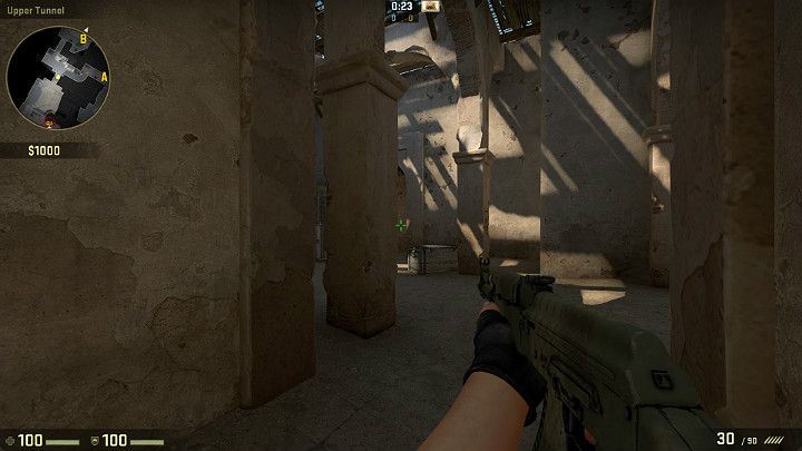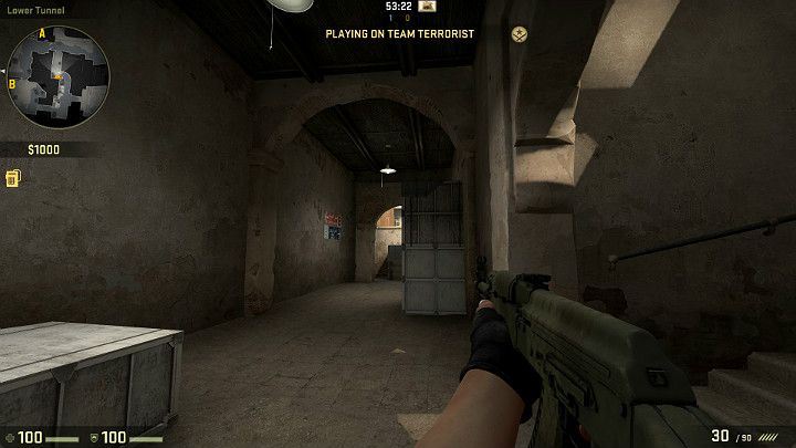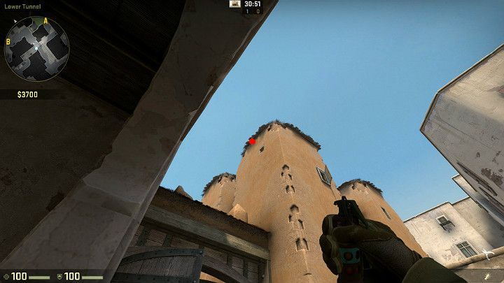 If you hide in the previously described hole in the wall, you will have a clear view of the tunnel and any Terrorists. On the other hand, if you are on the Terrorist side, this location can be great for defending bombsite B (that is, if one of your companions is watching the other passage behind your back).