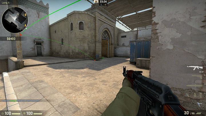Throw another flashbang entering the long passage that leads to bombsite A. Examine the picture to adjust your position and aim. Hit LMB to throw your grenade.