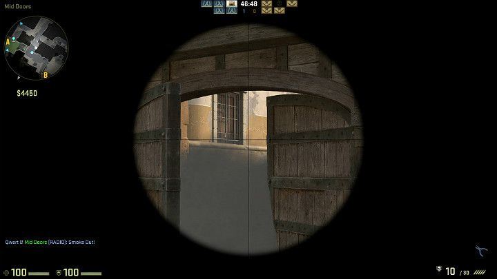 The doors in the picture are another example of a passage that you should protect. However, watch out for players using AWP, as they can spot you through the narrow gap. When that happens, they will fire immediately without hesitation. In order to move safely through this part of the map you should jump while running or use a smoke grenade.