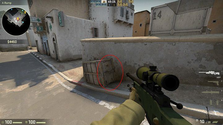 You can perform another interesting throw when you are on your way to bombsite A. Stand against the wall, next to the crate, and aim at the marked spot. Now press LMB to throw your grenade.