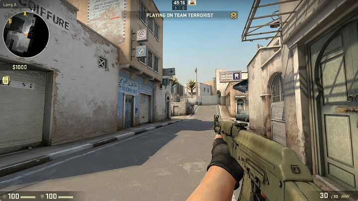 This is the long passage leading to bombsite A, seen from the perspective of a Terrorist. Opponents will frequently hide around the corner, especially at the beginning of a round. You should also pay attention to the container on the left and lower terrains on the right.