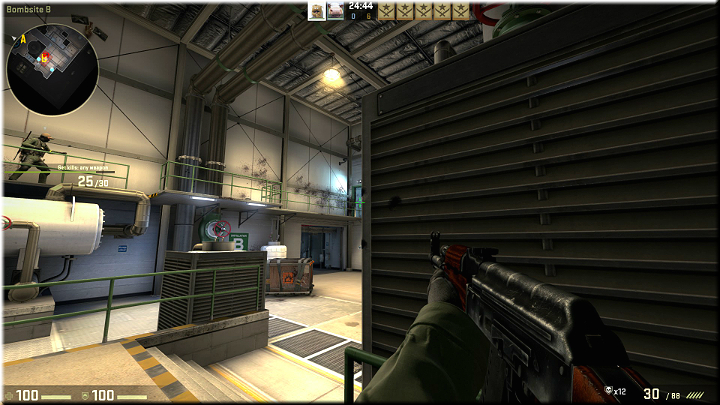 Standing on the lowest level, you can hide behind the vent shaft. From here, you can watch the upper entrance, the lower corridor on the left, and, leaning to the right, you can attack the enemies that storm via the passage on the right. Turning to the left allows you to lay fire on another hallway.