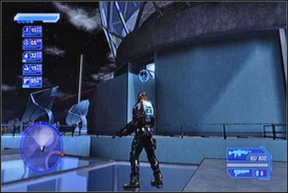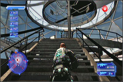 You should find yourself on the roof of transparent tunnel connecting two buildings. Take off it and land near the entrance to the sphere on a small platform (check the picture below). Meanwhile watch out for the guards, because they may knock you off and force to do all the jumps again.