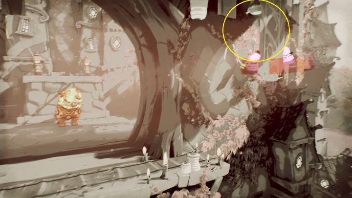 The hidden gem can be found in the upper part of the building. You can fly there by using the purple mask.