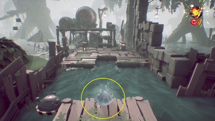 Immediately after the motorboat sequence, turn around, perform a slide and a double jump. Reach the small area in the center of the river.