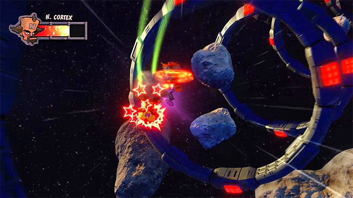 In this stage you must fly perfectly with a jet pack. During your flight you must notice small asteroids and mines when they are far away from you and move to the sides or up/down in order to avoid hitting them. Touching an obstacle doesn't mean that you die immediately but Cortex can get farther away which increases probability that he will escape.