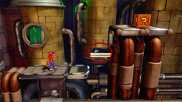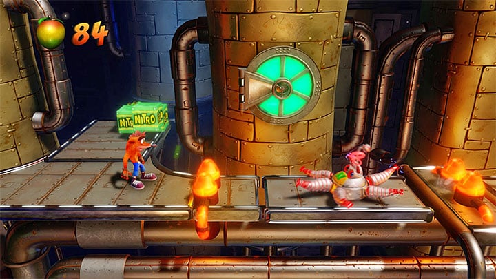 If up to this point you didn't die then in the place that you passed by, picture 1, you can find a platform that will transport Crash on the Death Route. When you get there you must first watch out for pistons (jump on the right one at the right moment) and crates with nitroglycerine. You will also come across scientists with shields. You must push them back skillfully.